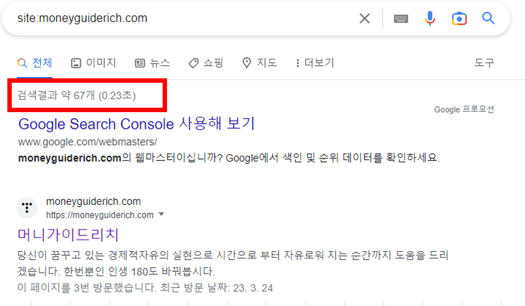 예를 들어 moneyguiderich.com의 의 색인 상태를 확인하려면 구글 검색에 site:moneyguiderich.com 를 입력합니다. 구글이 색인을 생서한 사이트의 페이지수를 알려줍니다.