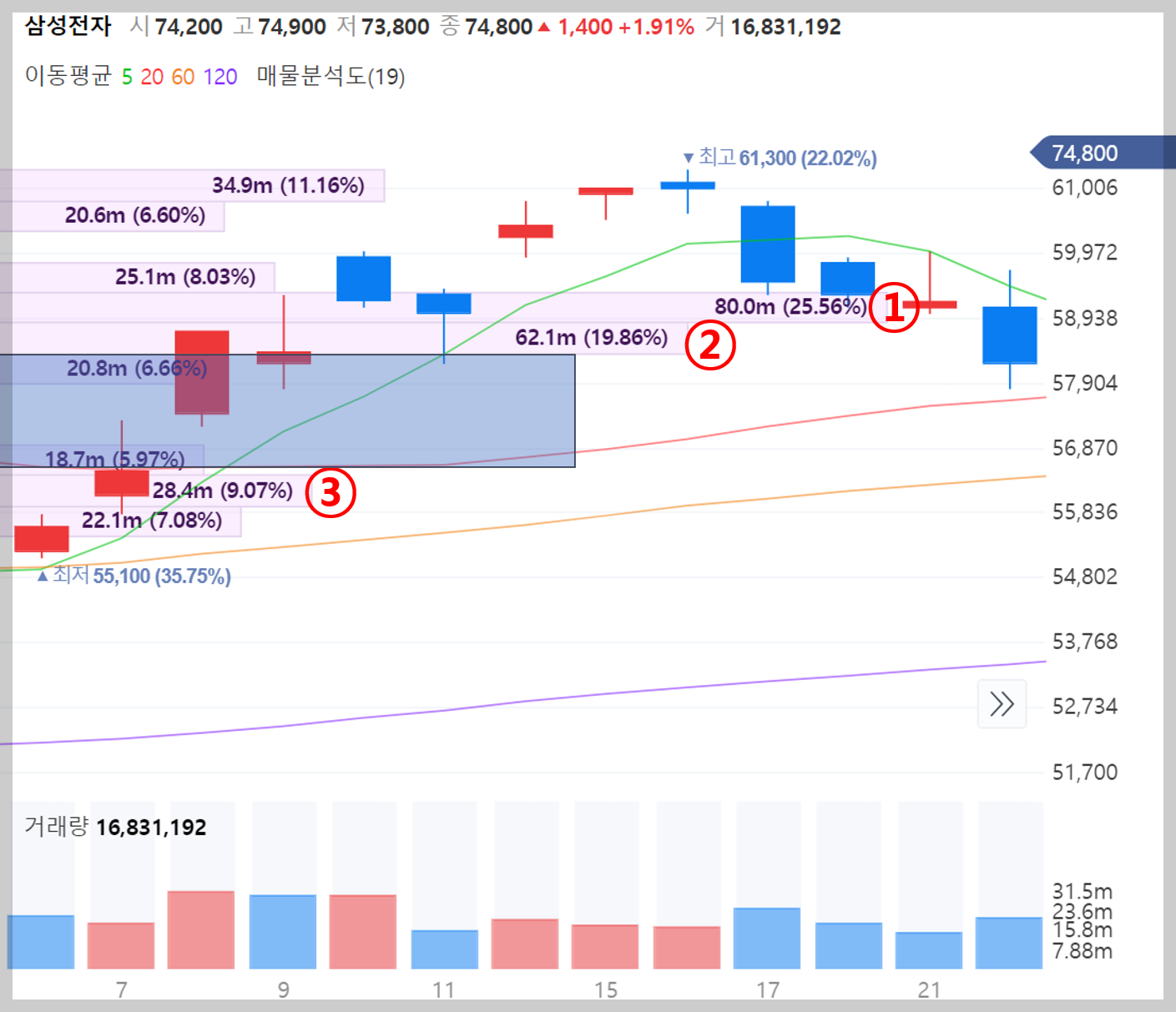 오늘 ③ 번 매물대 지지선을 뚫지 못한 것으로 볼 수 있습니다.