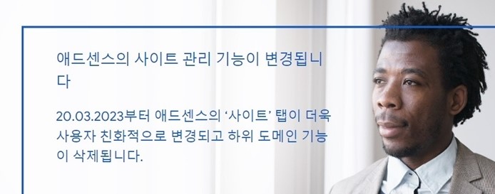 "애드센스의 사이트 관리 기능이 변경됩니다. 20.03.2023부터 애드센스의 '사이트'탭이 더욱 사용자 친화적으로 변경되고 하위도메인기능이 삭제됩니다." 이 메일을 보고 놀라셨을 블로그유저님들! 앞으로 블로그로 돈벌려고 하셨던 많은 분들 "뭐냐 장난하냐" 했겠지만 이불편한 메세지의 진실은 여러분에게 구글이 더 편리하게 기능을 추가하겠다는 이야기 입니다.