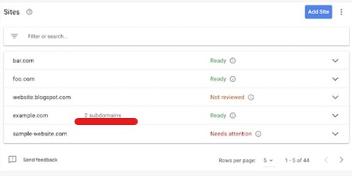 어떤 사이트에 하위 도메인이 있는지 확인하려면 '사이트'탭에 있는 표에서 '하위도메인'이라는 설명을 찾아보세요.예를 들면 위 스크린샷에서 example.com은 하위 도메인이 있는 사이트입니다.
