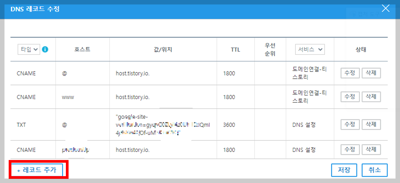 ※ 가비아에서 설정된 호스트(XXX)는 티스토리 블로그에 도메인 앞에 입력할 명칭입니다.