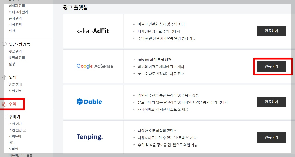 11. 티스토리 관리> 수익에 애드센스 연동하기를 해주시면 됩니다.
