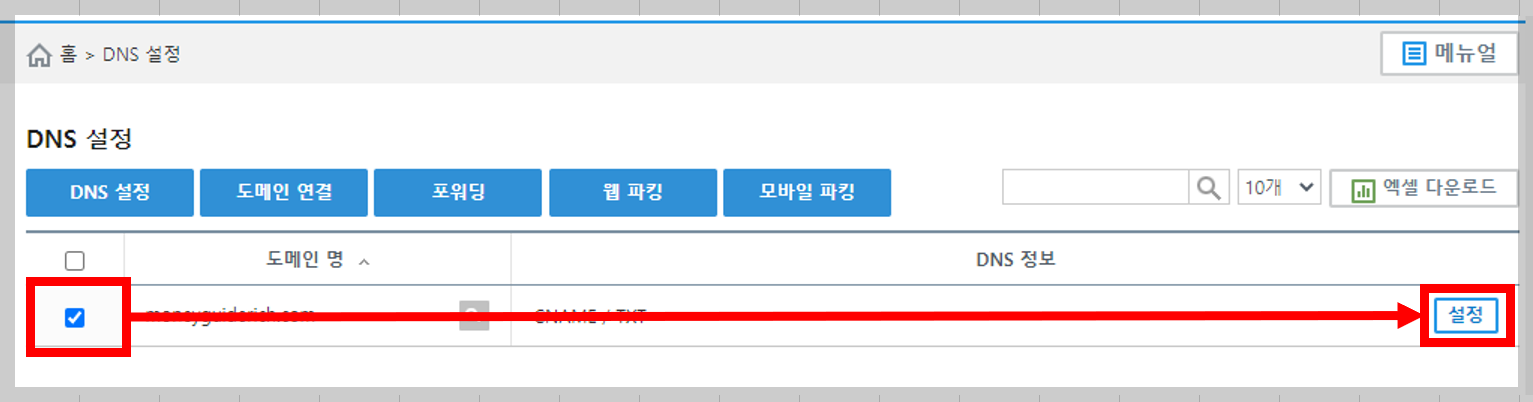 3. 해당도메인에 "체크박스 선택후 설정"을 클릭합니다.