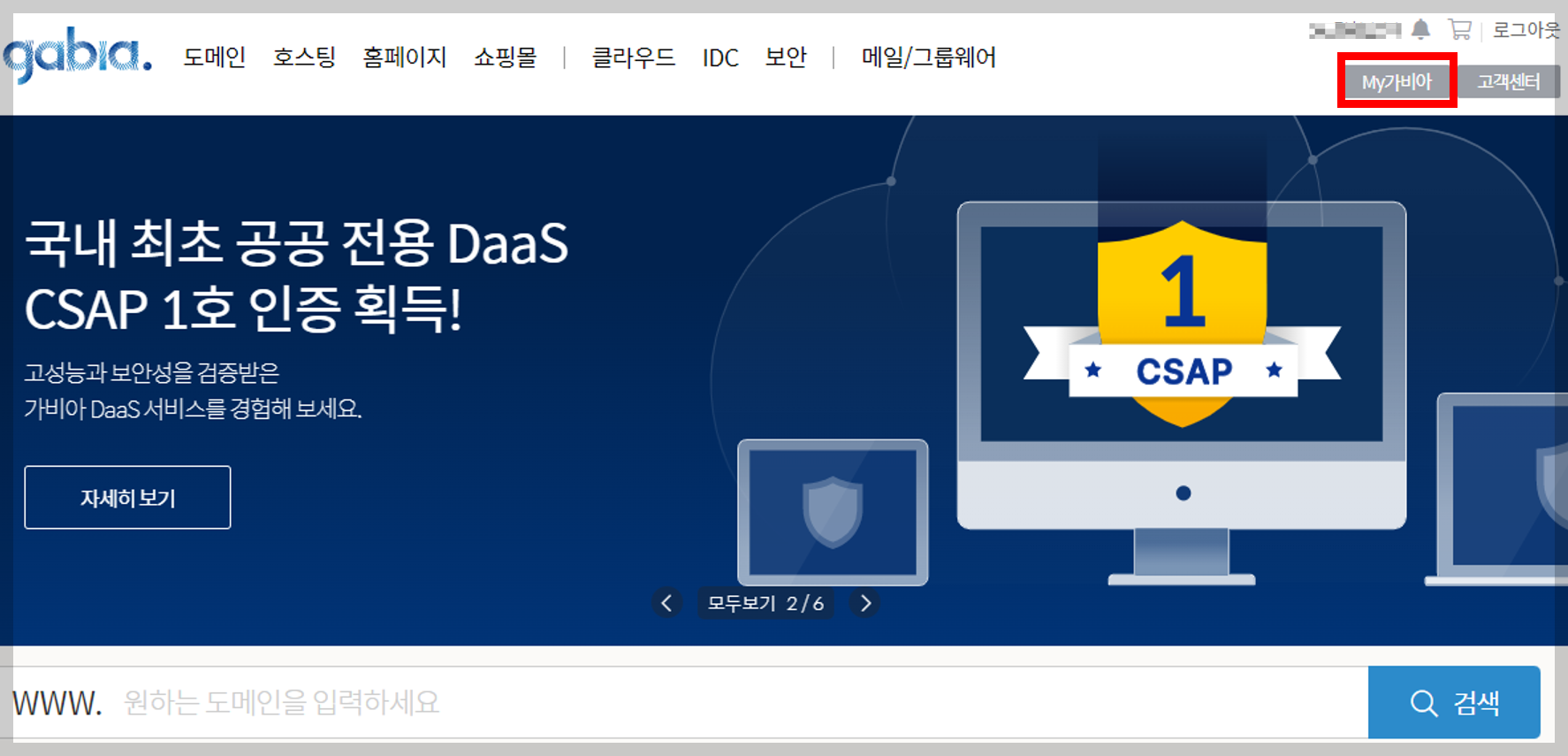 1. 도메인을 구입한 웹사이트에 접속합니다. "My가비아"를 클릭합니다.