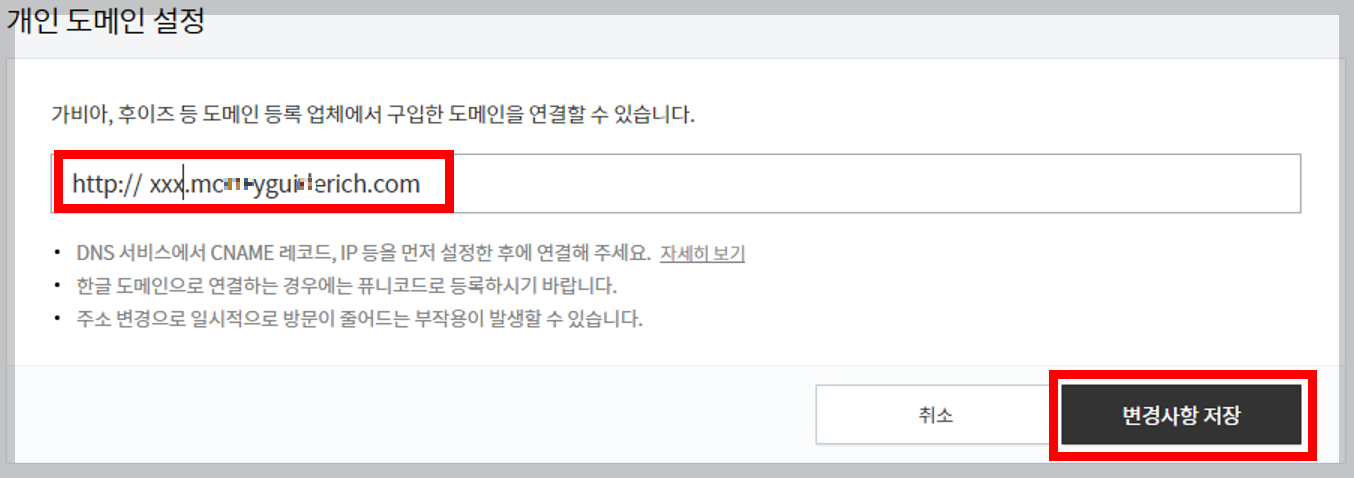 9. 위에서 처럼 개인도메인 앞에 xxx(가비아에서 입력한 것과 동일해야 합니다)을 입력하고 변경사항 저장을 클릭하면 연결됩니다.
