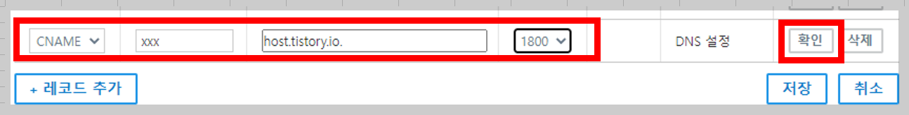 6. 추가된 레코드에 타입은 CNAME, 호스트는 추가된 블로그의 명칭, TTL에는 1800, 마지막에 확인을 눌러 추가설정을 마칩니다.
