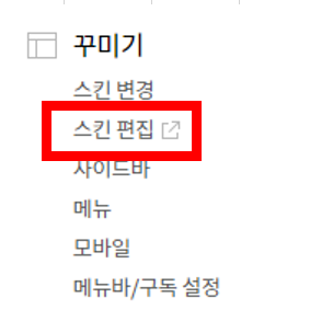 1. 티스토리 관리자 화면에서 "꾸미기"메뉴에서 "스킨편집" 메뉴를 클릭한다.