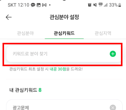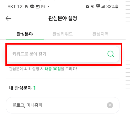 "관심분야" 탭 클릭 후 키워드로 분야 찾기라는 곳에 관심분야 키워드를 넣고 검색을 합니다.