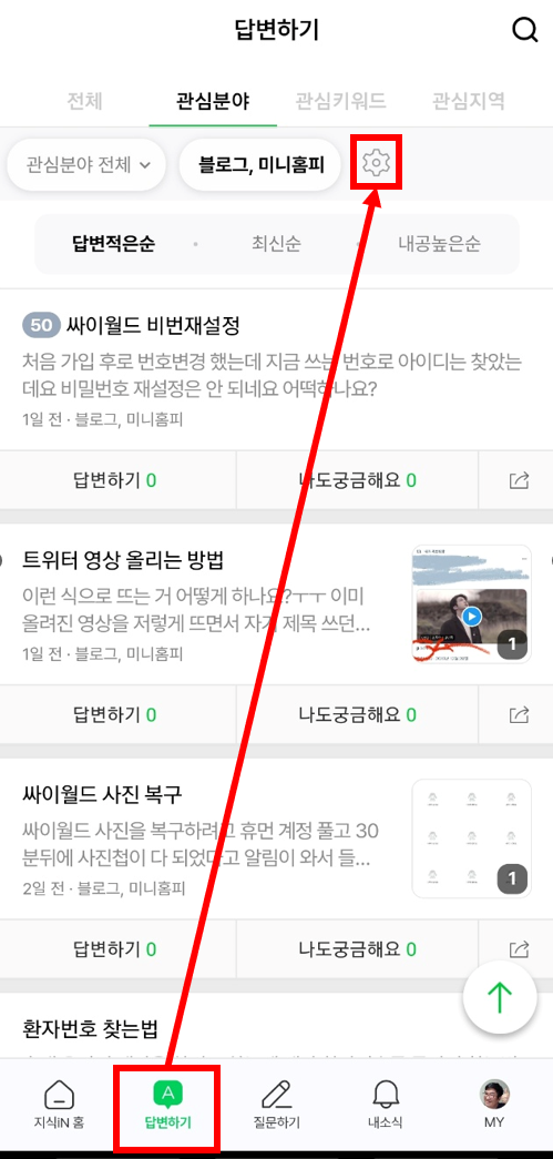 하단메뉴 "답변하기"를 클릭하신 후에 상단에 보면 관심분야 탭에 톱니바퀴모양의 아이콘이 있습니다. 클릭합니다.