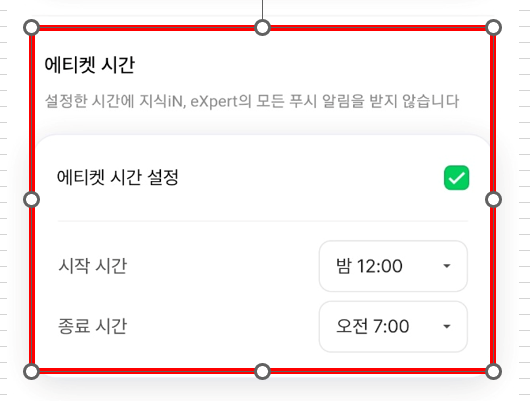 앱설치 및 등록과정의 3번째에서 하단에 내려가면 에티켓시간설정이 있습니다. 시작시간과 종료시간을 설정하셔서