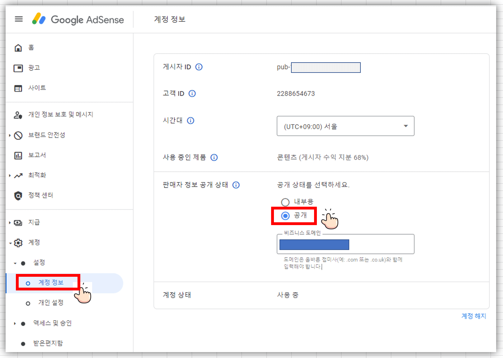 하단에 있는 판매자 정보 공개 상태를 공개를 클릭하시고 비지니스 도메인에 티스토리 도메인을 입력합니다.