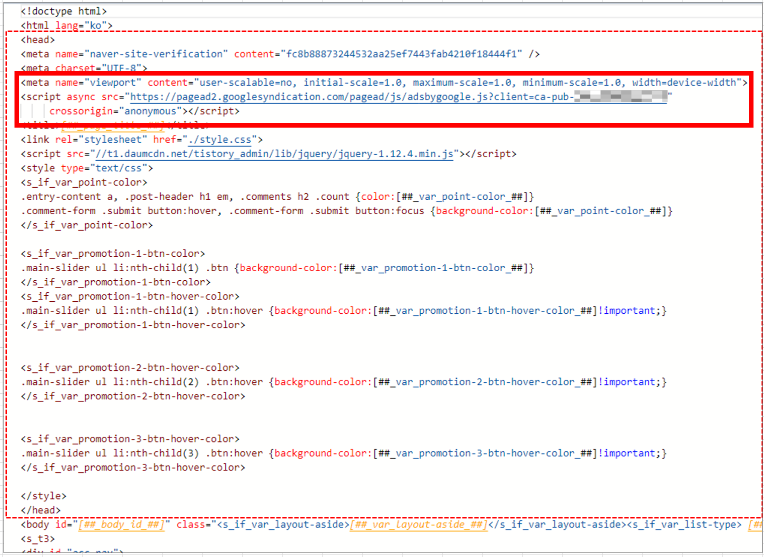 티스토리 블로그 스킨편집 HTML편집 사이에 구글 코드 위치 조정